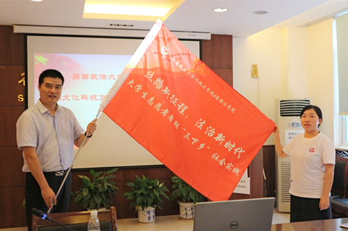 会议伊始,徐峰副书记为“丝路新征程,法治新时代”依法治国宣讲团指导老师张文浩和张静授旗。授旗仪式结束后,本次“三下乡”社会实践重点团队的团长冉启云介绍了各项活动的流程与安排,据悉,此次“三下乡”社会实践活动分“两个阵地”和“两个时间”进行,我院本科2016级共计28名同学被分为两个小组分别在广东和重庆开展活动,重庆主要针对“丝绸之路经济带”开展依法治国宣讲和调研,广东主要针对“21世纪海上丝绸之路”开展宣讲和调研,并实地走访海上丝绸之路古遗迹。活动包括7月14日至7月16日、7月21日至7月22日两个时间段,届时,团队成员将围绕“一带一路”与“依法治国”两个主题展开一系列活动。紧接着,张文浩老师从前期准备、活动开展、后期宣传等方面向大家提出要求,希望大家注重团队效率,齐心协力做出成绩。张静老师随后发言,张静老师强调了活动期间的纪律与安全问题,希望同学们严格遵守相关纪律要求,服从管理,注意安全,同时,张静老师就活动的形式与内容提出建议,希望同学们好好把握此次活动的机会,深入调研,有所收获。徐峰副书记最后发言,针对交通、食宿等方面提出建议,再三叮嘱同学们要注意安全,并预祝本次“三下乡”社会实践活动取得圆满成功。最后本次会议进入自由讨论时间,团队成员询问了有关调查问卷、实习请假等相关问题,并与老师们一起探讨了活动的具体地点与开展形式等问题。
