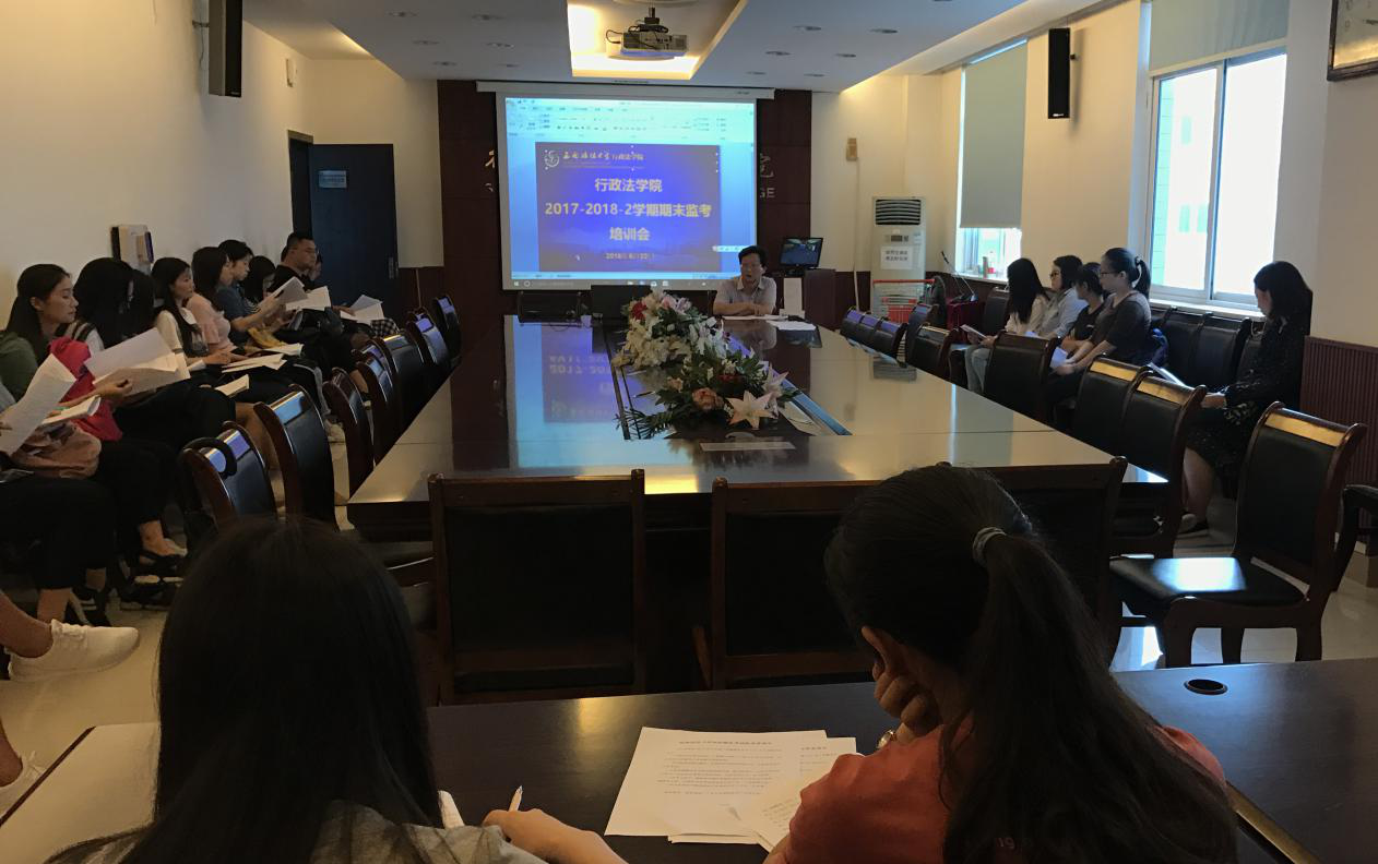 2018年6月22日15:00时,行政法学院2017-2018学年第二学期本科期末监考人员培训会在敬业楼4032会议室召开。金承光副院长、学院本科教学秘书和全体研究生监考人员参加了本次培训会。