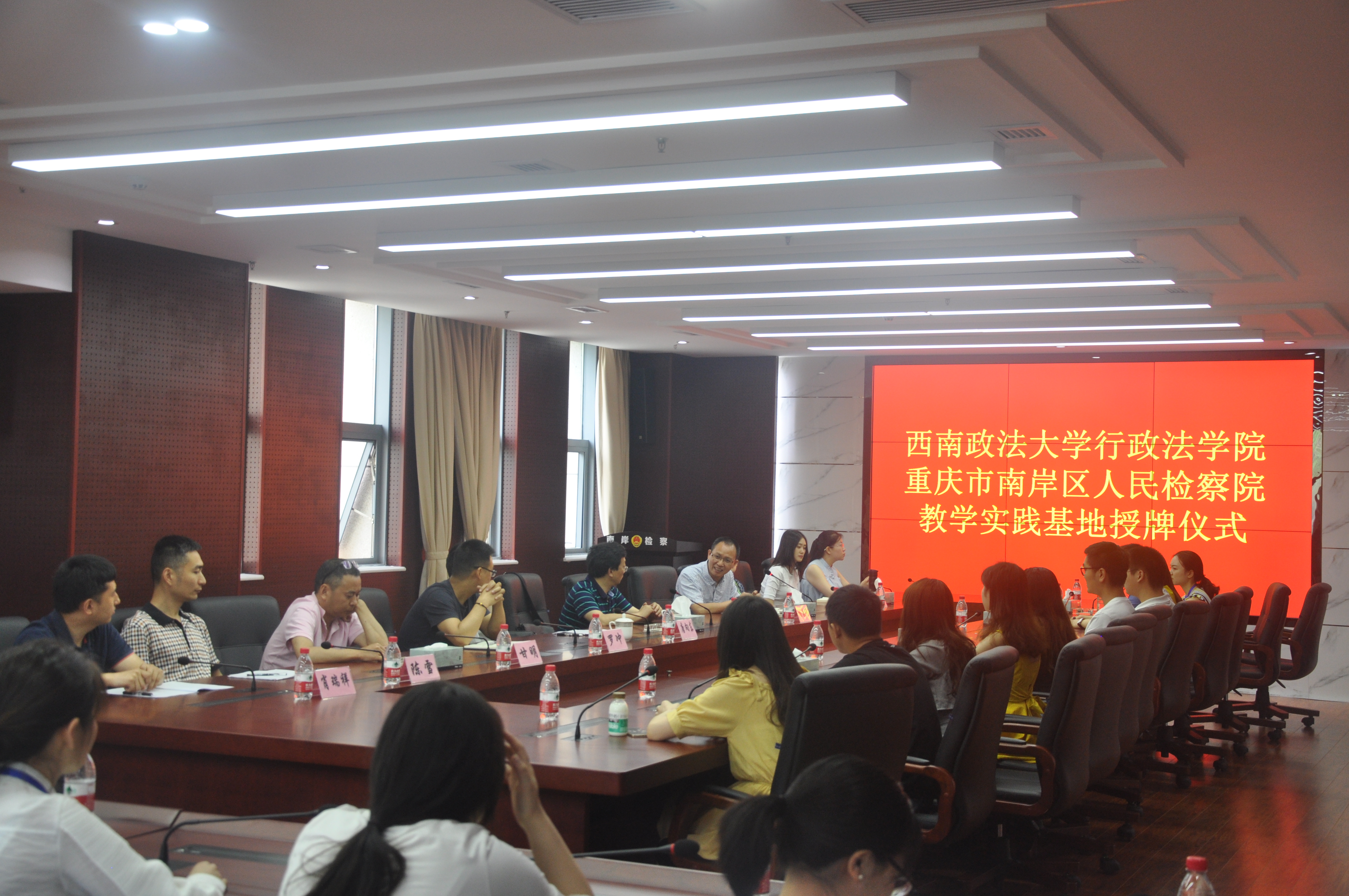 2018年6月8日上午10点,行政法学院、监察法学院副院长金承光、实习指导老师唐向东代表学院参加我校与重庆市南岸区人民检察院共建教学科研实践基地揭牌仪式暨2016级硕士研究生实习总结会。南岸区人民检察院政治部李朝东主任、罗冲副主任、南岸区人民检察院各科室及实习指导教师代表出席了会议。