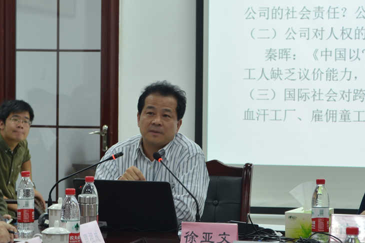 本次交流会首先由主讲人徐亚文教授引出工商业与人权的论题并就人权义务发表自己的见解与看法。他指出,时至今日,“公司的社会责任”对于中国企业,尤其是大公司,已不是一个陌生的名词,但“人权”观念的引入却有所欠缺,因此将“保护、尊重和救济”框架投入实践应用是很有必要的。紧接着,徐亚文教授又对“企业与公司”、“义务与责任”、“社会责任与人权义务”等词语概念进行辨析并提出了“低人权优势”、“两权分离”、“公司公民理论”等新型名词,总结了公司是一个市场、社会、政治的主体。最后得出无论从哪个主体方面讨论公司,公司都应该承担人权义务。