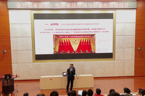 法安天下,德润人心。依法治国和以德治国是新时代中国法制建设的核心和历史发展的必然要求,所以应当坚持依法治国和以德治国有机结合和统一,努力做到以法卫德,以德明法,德法并重。至此本次金开名家讲坛在同学们的掌声中圆满结束。