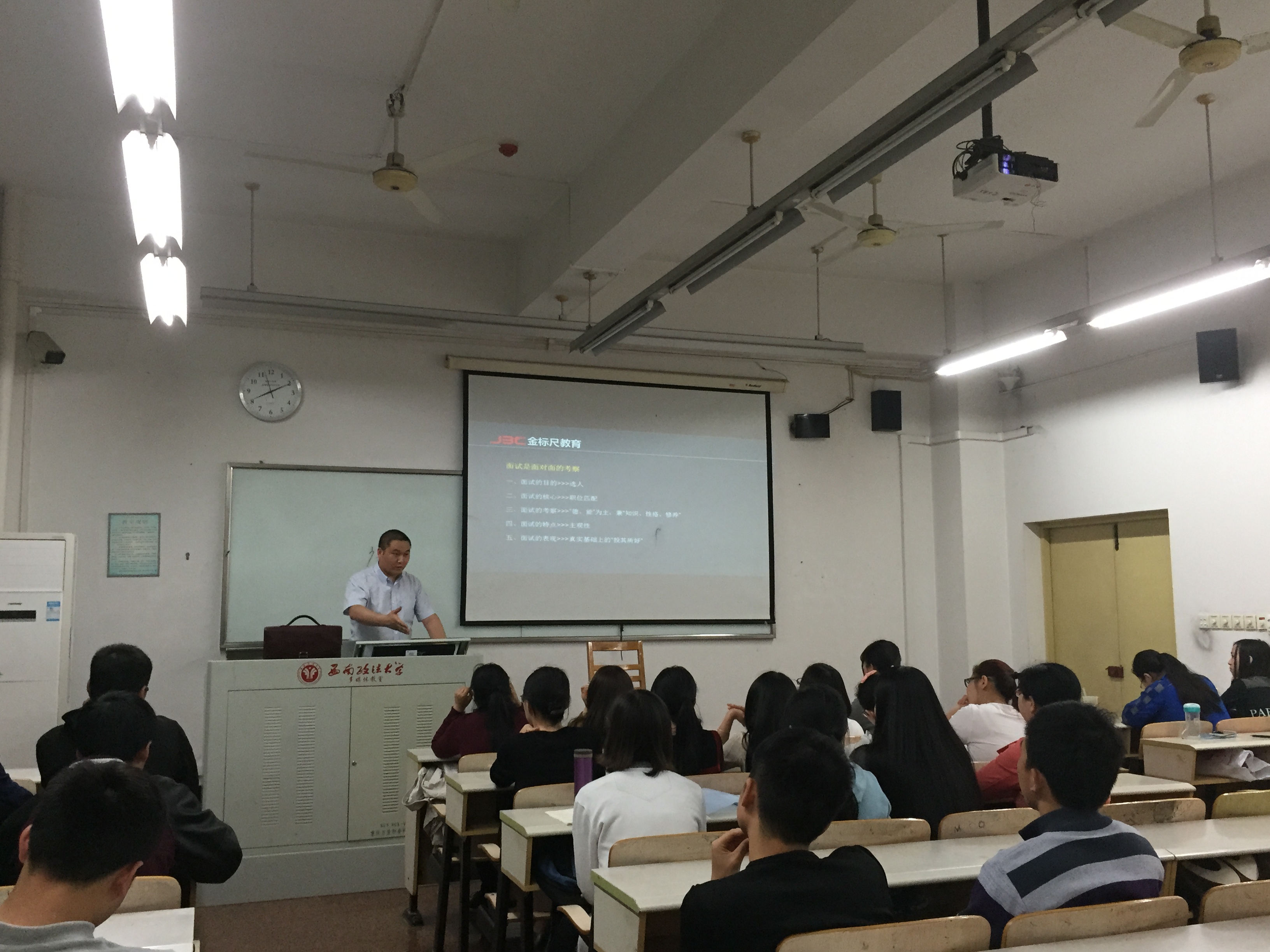 本次培训课程特邀重庆市江北区金标尺职业考试培训有限公司的资深教师杜老师为同学们讲授简历制作、面试礼仪、就业规划等课程,参加此次课程的是来自行政法学院2012级的25名同学,12级辅导员张静、骆黎也到场参与。课上,杜老师紧紧围绕简历技巧和面试技巧两个方面,针对本周四即将举办的双选会为同学们做了求职指导。首先,杜老师详细介绍了面试的目的、核心、考察、特点以及表现方面的内容,然后为同学们讲解了常见的六种面试误区和解决办法;接着,杜老师请同学们上台作答面试题目,并针对同学们的不足,用举例的形式生动的讲授了面试作答原则;最后,杜老师如第一期就业培训课程一般为同学们留下课后作业,要求同学们在第二堂课前制作好纸质简历,以方便后续开展一对一的简历制作指导。同学们经过第一期就业训练营课程的学习之后,深感课程的实用性,因此此次课程上听讲更加认真,表现更加积极,课堂氛围十分活跃。